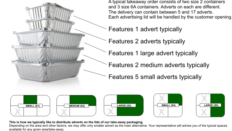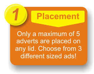 Your advert can be the sole advert or one of only a maximum 4 others on a lid that will be sent as part of a TakeAway delivery. The small number of ads means you have the highest rate possible of having your brand or business noticed and placed directly in front of the person opening the TakeAway.