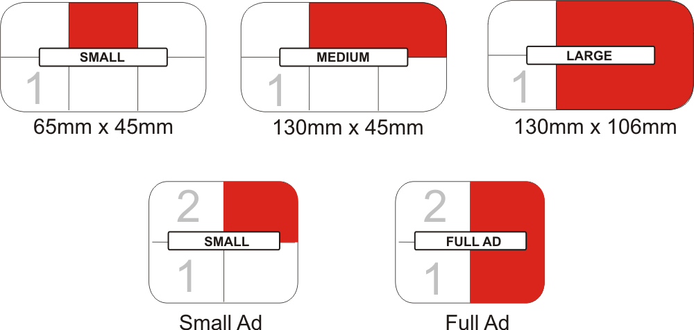 We can offer single 1/6 small ads right up to 2/3 large ads in multiple locations and combinations.